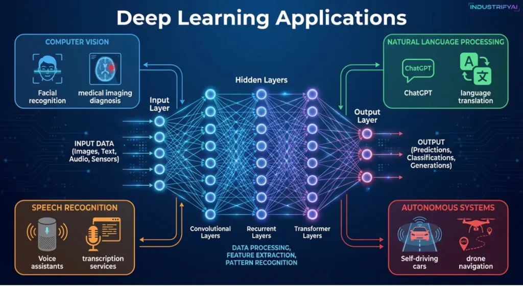 The “deep” in deep learning refers to multiple hidden layers in neural networks – sometimes exceeding 100 layers – that progressively extract higher-level features from raw input. This automatic feature extraction eliminates the need for manual feature engineering, a time-consuming process in traditional ML.
