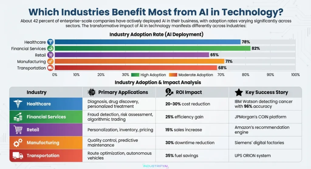 About 42 percent of enterprise-scale companies have actively deployed AI in their business, with adoption rates varying significantly across sectors. The transformative impact of AI in technology manifests differently across industries: