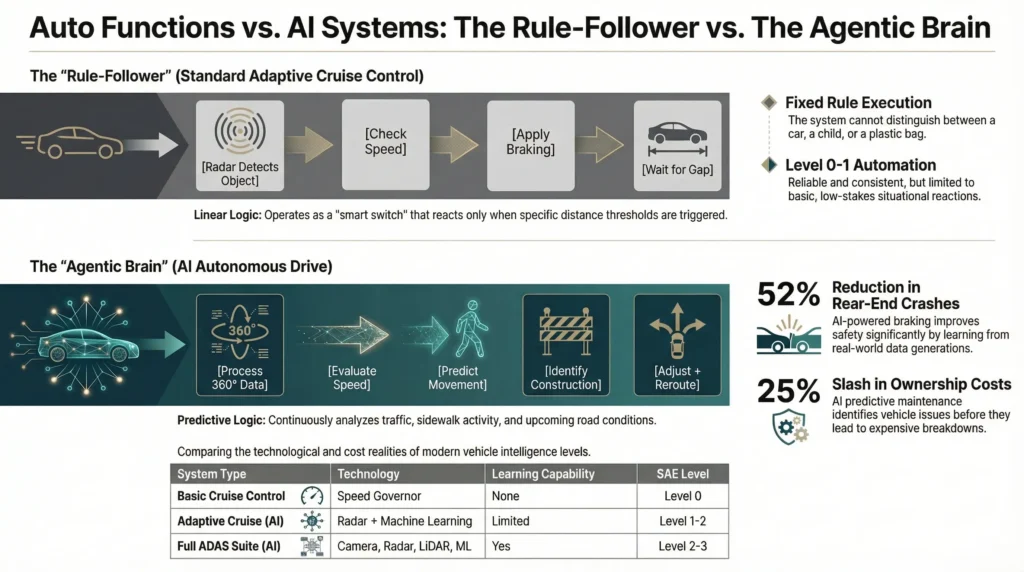 Automatic functions follow fixed rules. They do the same thing every time, in the same situation. Traditional cruise control is a perfect example. You set a speed, the car holds it. That’s it. No learning, no adapting, no thinking. The system reacts to your input and nothing else.